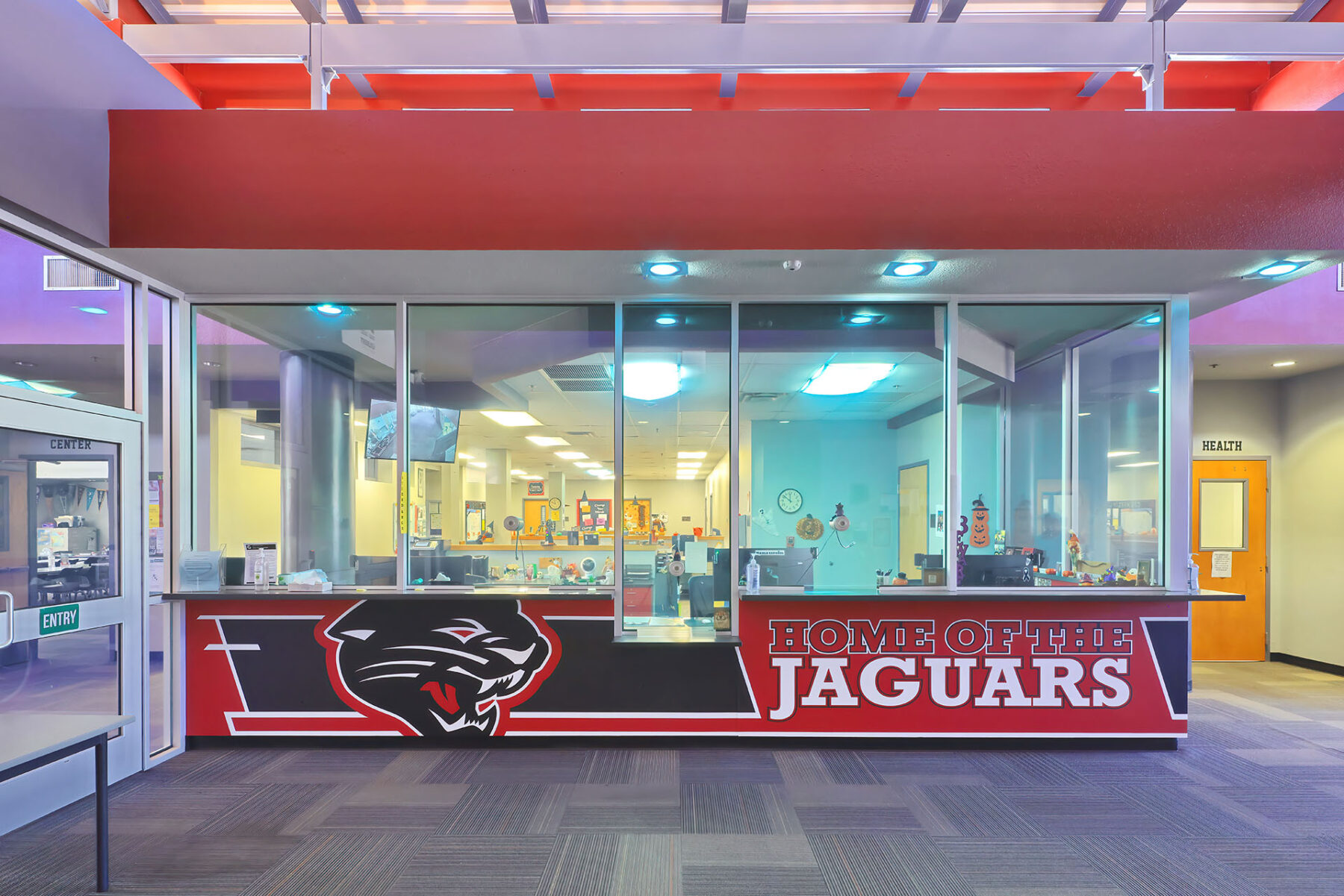 Safety in our schools remains our commitment to our K-12 clients. We gladly worked simultaneously with Highland High School, Desert Ridge High School, Canyon Valley High School, Camp Verde High School, and Mesquite High School in the construction of a brand-new front entry way lobby with security in mind. We utilized the most up-to-date security equipment and materials to create an open concept but allow a safe passage onto the campus. These renovations included installing new storefront systems and secured entry ways with cameras, speakers, door hardware security and protected glass systems.